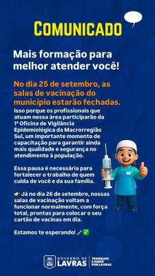 No dia 25 de setembro, as salas de vacinação do município estarão fechadas. Isso porque os profissionais que atuam nessa área participarão da 1ª Oficina de Vigilância Epidemiológica da Macrorregião Sul, um importante momento de capacitação para garantir ainda mais qualidade e segurança no atendimento à população.