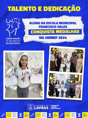 Nossa aluna Ellen Pedrozo Valentim, da Escola Municipal Francisco Sales, brilhou na OBMEP – Olimpíada Brasileira de Matemática das Escolas Públicas 2024: conquistando medalha de bronze nacional e medalha de prata estadual .