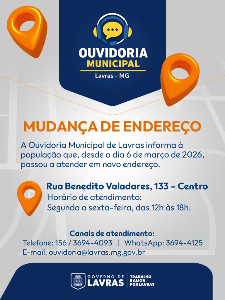 O horário de funcionamento permanece de segunda a sexta-feira, das 12h às 18h. A população pode entrar em contato com a Ouvidoria por meio do telefone 156, pelo WhatsApp (35) 3694-4125, pelo telefone fixo (35) 3694-4093 ou ainda pelo e-mail [email protected].